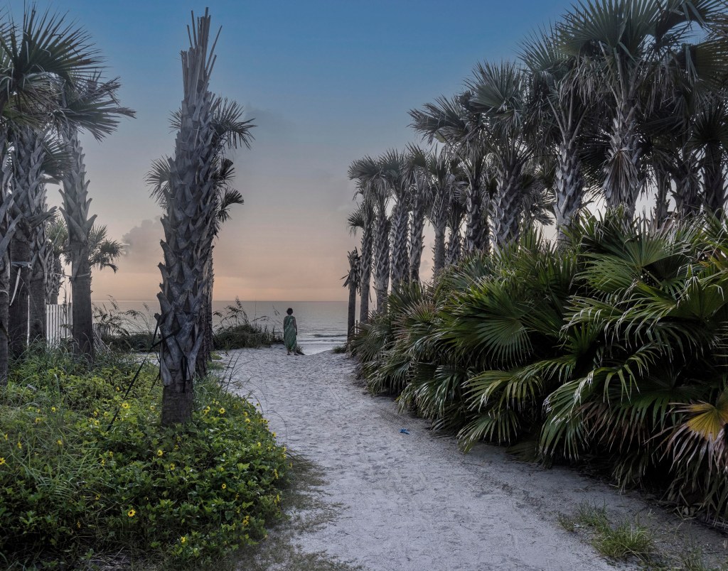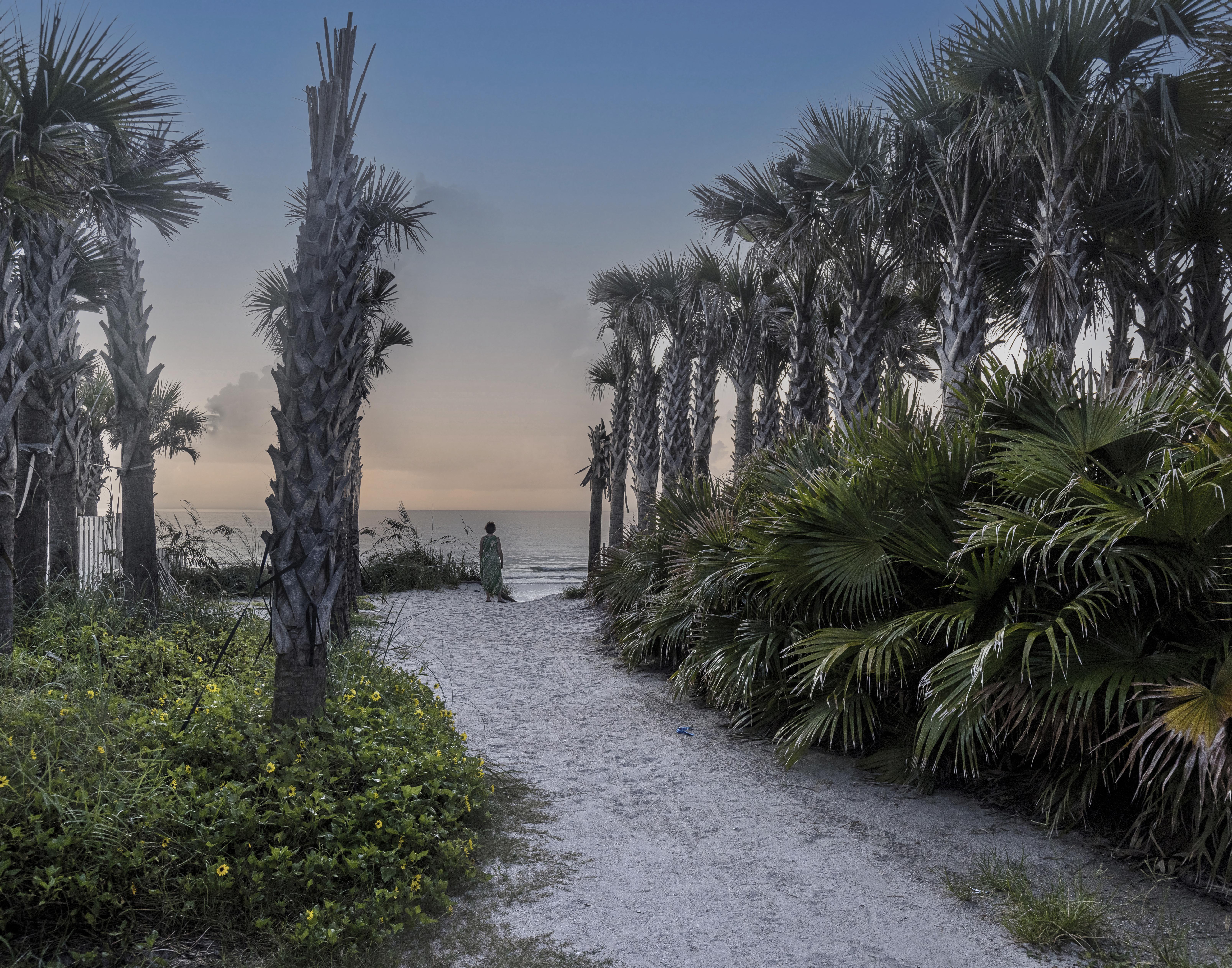 Palms framing the well‑trod path.